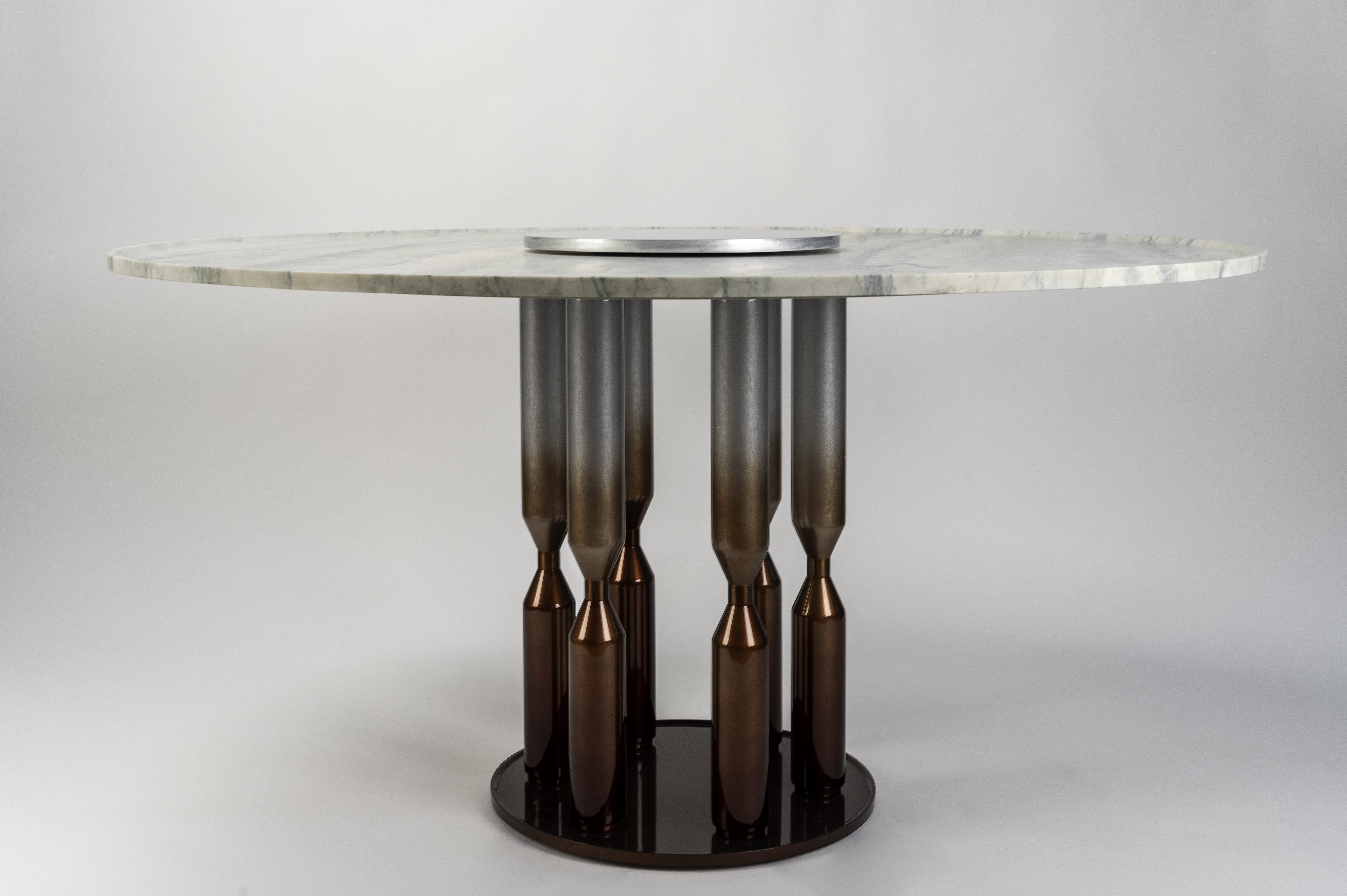 The HORAS table is inspired by the passage of time. The marble countertop with the round metal platform in the centre resembles the face of a clock and the shape of the metal legs remind us of hourglasses. Our mission is not simply to design a table but to create a piece of furniture that stands the test of time.